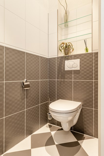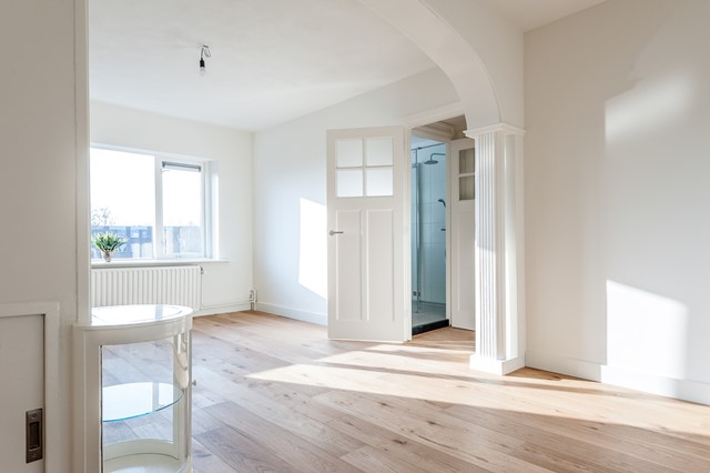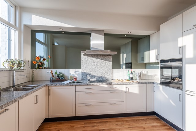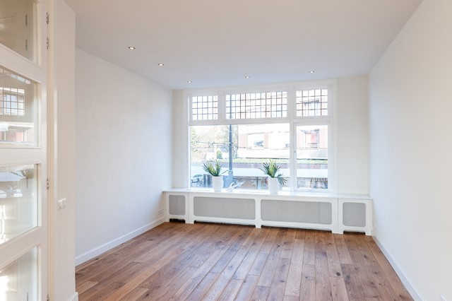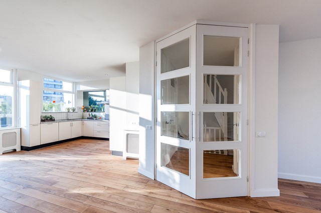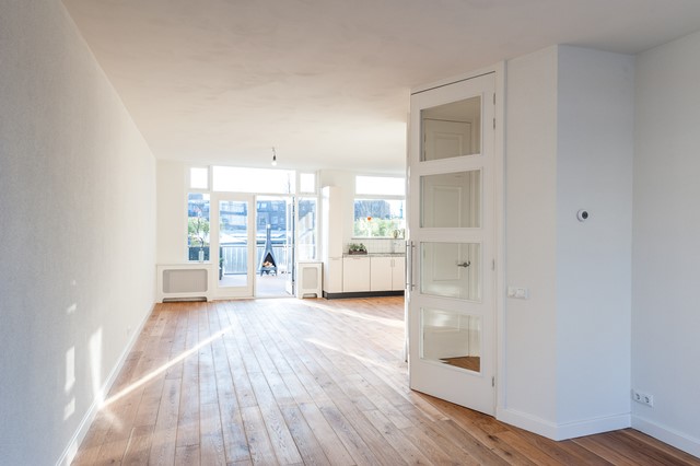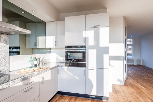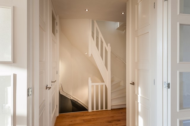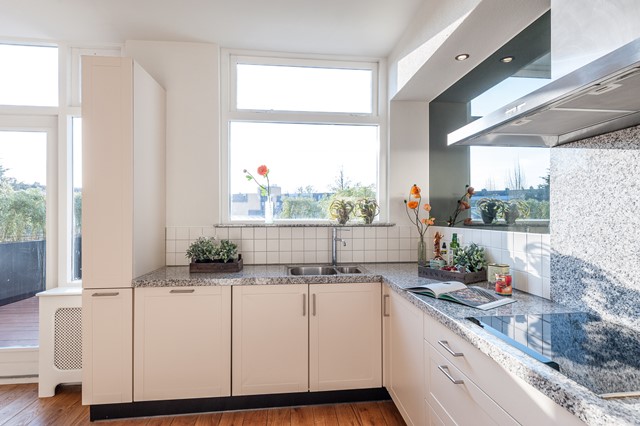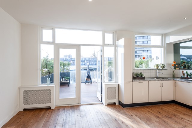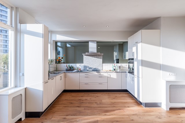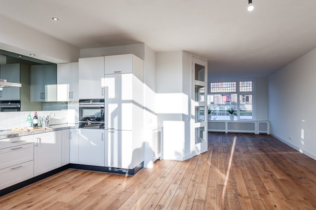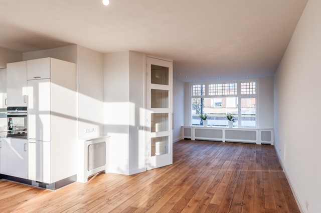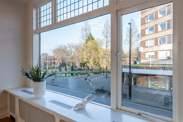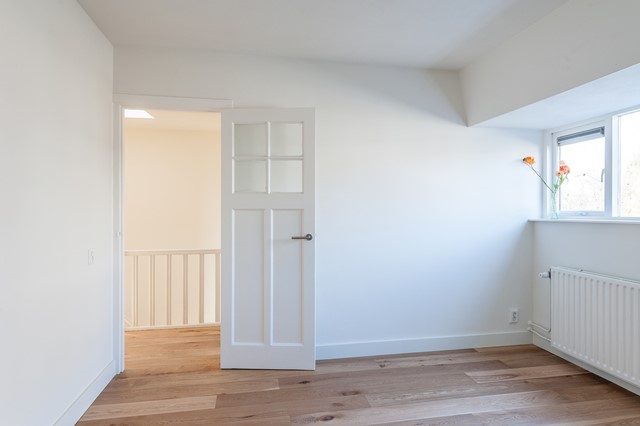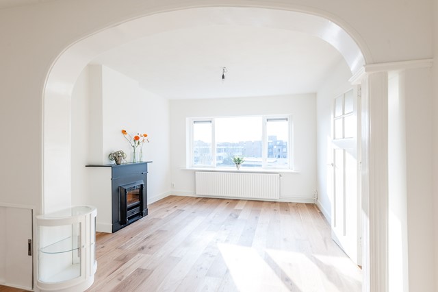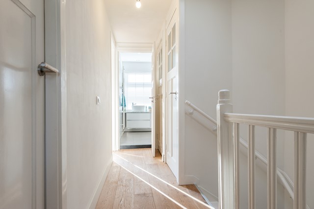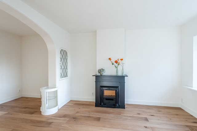 -Middels de eigen entree bereik je eerste etage, met de ruime hal, het separate toilet en de studeer- / slaapkamer aan de voorzijde. De L-vormige woonkamer is bereikbaar middels openslaande deuren en beschikt over een luxe keuken met diverse apparatuur.