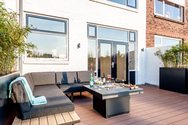 Je stapt vanuit de woonkeuken direct naar buiten op het chique afgewerkte terras. Hier kun je in de middag en avond vrij van de zon genieten.